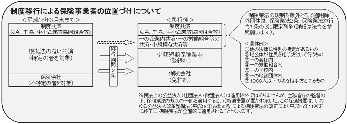 • 平成18年4月1日以降、引き続き新規の保険契約(共済契約を含む。以下同じ。)を引き受けている根拠法のない共済団体で保険業法の規制対象となった団体は、保険業法上「特定保険業者」と定義されます。この特定保険業者は、各財務局(又は財務事務所)に届出を行っており、平成20年3月末までに、少額短期保険業者の登録申請又は保険会社の免許の申請、他の保険会社・共済の活用や保有する保険契約の移転などをして特定保険業者として廃業をするなどの今後の対応方法を決定します。その後は原則として、平成21年3月末までに当該対応に沿って移行していくこととなります。
