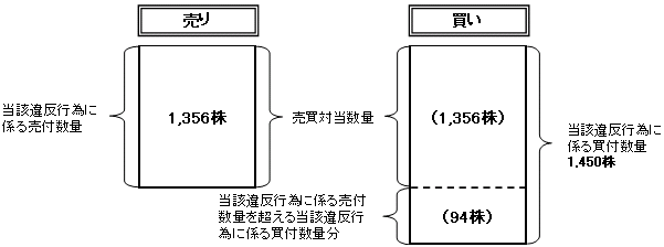 -  (2)当該違反行為に係る有価証券の売付数量が買付数量を超える場合の、当該超える数量に係るものについて、 (有価証券の売付価額)-(当該違反行為が終了してから1月を経過するまでの間の当該有価証券の最低価格×当該超える数量) または、 当該違反行為に係る有価証券の買付数量が売付数量を超える場合の、当該超える数量に係るものについて、 (当該違反行為が終了してから1月を経過するまでの間の当該有価証券の最高価格×当該超える数量)-(有価証券の買付価額) との合計額として計算される。 - (注1)売買対当数量:当該違反行為に係る有価証券の売付数量と買付数量のうち、いずれか少ない数量をいう。